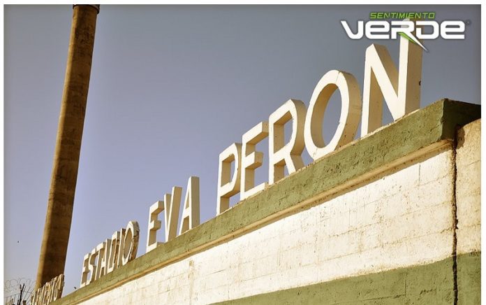 Pero el vínculo de Eva con Junín se extendió hacia el Club Atlético Sarmiento. Los verdes eran sensación. En 1945 habían llegado a semifinales del Campeonato de la República, cayendo en instancia definitoria ante Boca Juniors. El partido se jugó en cancha de BAP (Buenos Aires al Pacífico), que rebalsó de público. El presidente Héctor Díaz era íntimo amigo de Juan Duarte, hermano de Eva y fanático de Sarmiento. Fue quién entendió necesaria la construcción de un gran estadio de cemento. A fines de 1946 – cuando nadie soñaba que los verdes juninenses serían parte del profesionalismo porteño – Sarmiento recibió un préstamo por 250.000 pesos moenda nacional para la construcción de su estadio. La Comisión Directiva del club decidió que su nuevo estadio se denominaría “María Eva Duarte de Perón” – luego abreviado Eva Perón – y como se puede leer en el Memoria Balance “en homenaje y reconocimiento hacia la señora del Exmo. Sr. Presidente de la Nación y verdadera gestoria de la realización de la monumental obra”.